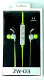 Geeko ZW-03 Wireless Bluetooth Earphones , BT4.2 , Rechargeable Polymer Lithium-on Battery -Green, Retail Box , 1 year Limited Warranty