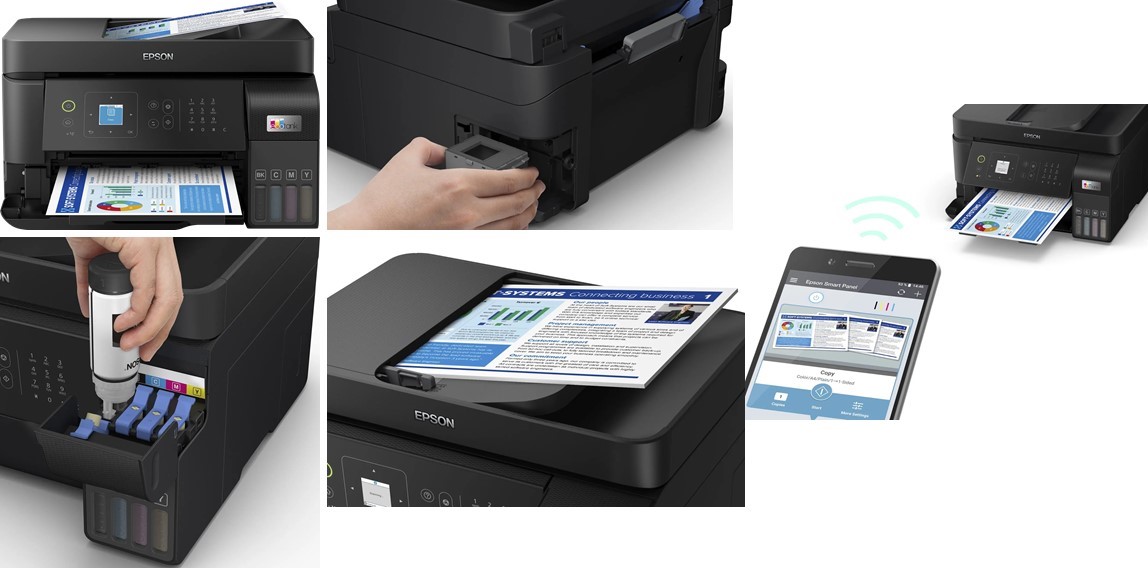 Epson EcoTank L5590 4-in-1 Colour Ink Tank System Printer – Print Size A4, Print, Copy, Scan & Fax, Print Speed Up to 15ppm Black & 8ppm Colour, Print Resolution Up to 4800 x 1200 dpi, Duplex Printing Manual, Borderless Printing, Connectivity USB, Wi-Fi, Wi-Fi Direct, Paper Handling: 100 Sheet Input Tray, 30 Sheet Automatic Document Feeder, 1.4-inch Colour LCD Display, Apple AirPrint, Epson Smart Panel App, Epson Connect (Email Print, Remote Print Driver), Retail Box, 1 Year Warranty.