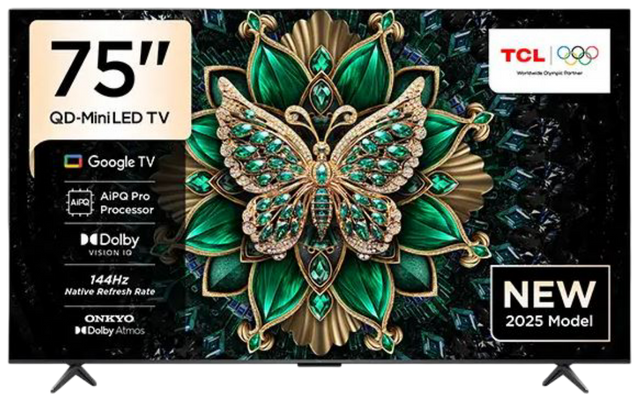TCL 75 Inch QD Mini LED 4K Google TV – Resolution 3840 x 2160 (4K UHD), Native Refresh Rate 144Hz , Color Gamut 93% DCI-P3, HDR Support Dolby Vision IQ, HDR10+, HLG, Contrast Ratio 5500:1, Peak Brightness up to 1000 nits. Audio: ONKYO 2.1 Hi-Fi system with 2x10W midrange speakers and 20W subwoofer, Processor AiPQ Pro for advanced image processing, Operating System Google TV with Google Assistant. Connectivity includes 4x HDMI 2.1 (eARC/ARC), USB 2.0/3.x, Ethernet LAN, dual-band Wi-Fi, Bluetooth 5.4. Dimensions without stand: approx. 1890 x 1086 x 57.9 mm; with stand: 1890 x 1161 x 372 mm, Weight approx. 23 kg, VESA mount 600 x 400 mm. Warranty 3 years.