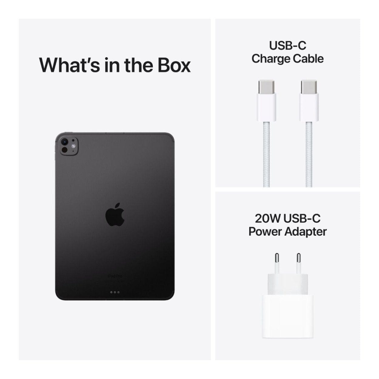 - In The Box: iPad Pro, USB-C Charge Cable (1m), 20W USB-C Power Adapter, Polishing cloth