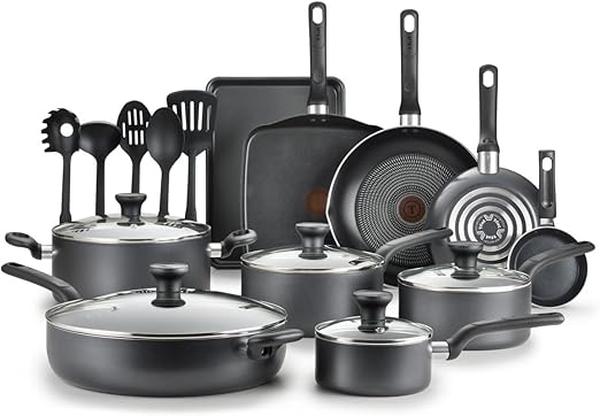 The T-FAL Easy Care 20-Piece Set in grey offers a versatile collection of cookware including fry pans, saucepans, a jumbo cooker, Dutch oven, griddle, and a cookie sheet, perfect for all your cooking needs. Crafted for durability and ease of use, this set also includes 5 nylon tools to enhance your kitchen experience. Ideal for both everyday meals and special occasions, it combines functionality and style in one comprehensive package.